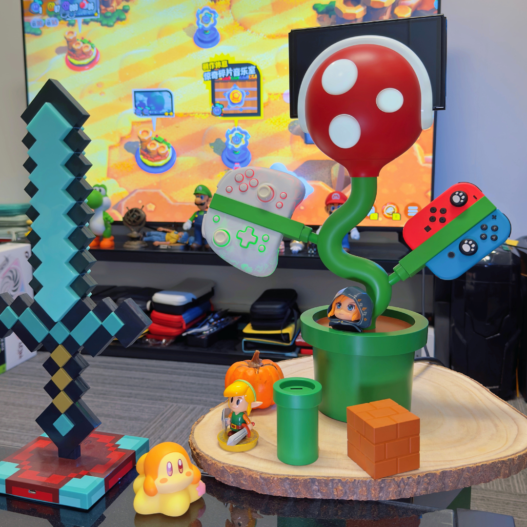 Switch 食人花多功能支架底座以遊戲花朵造型設計,張嘴便能穩固夾持主機,雙手則可固定手柄,趣味與實用兼具。